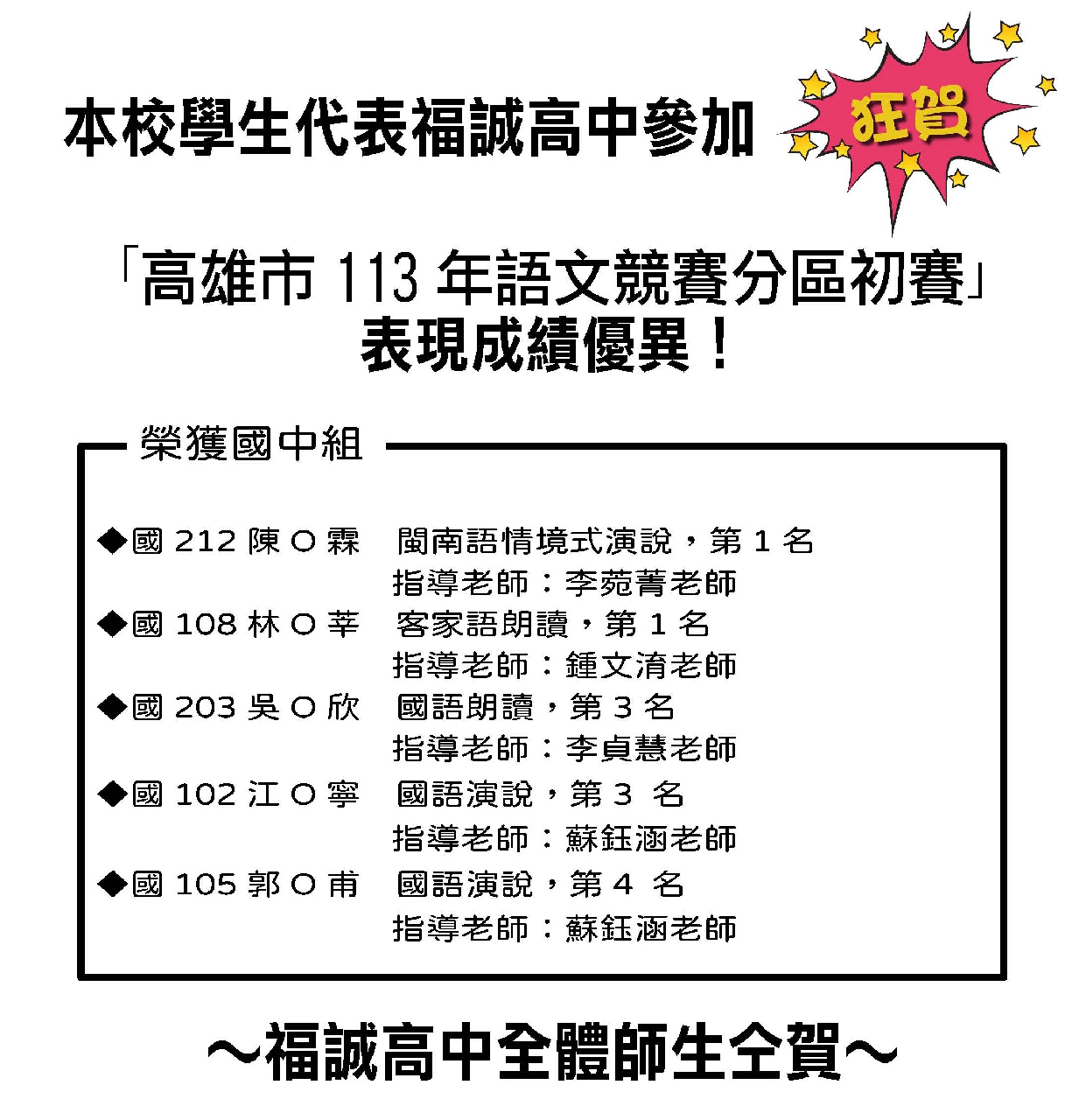 本校學生代表福誠高中參加「高雄市113年語文競賽分區初賽」表現成績優異!
