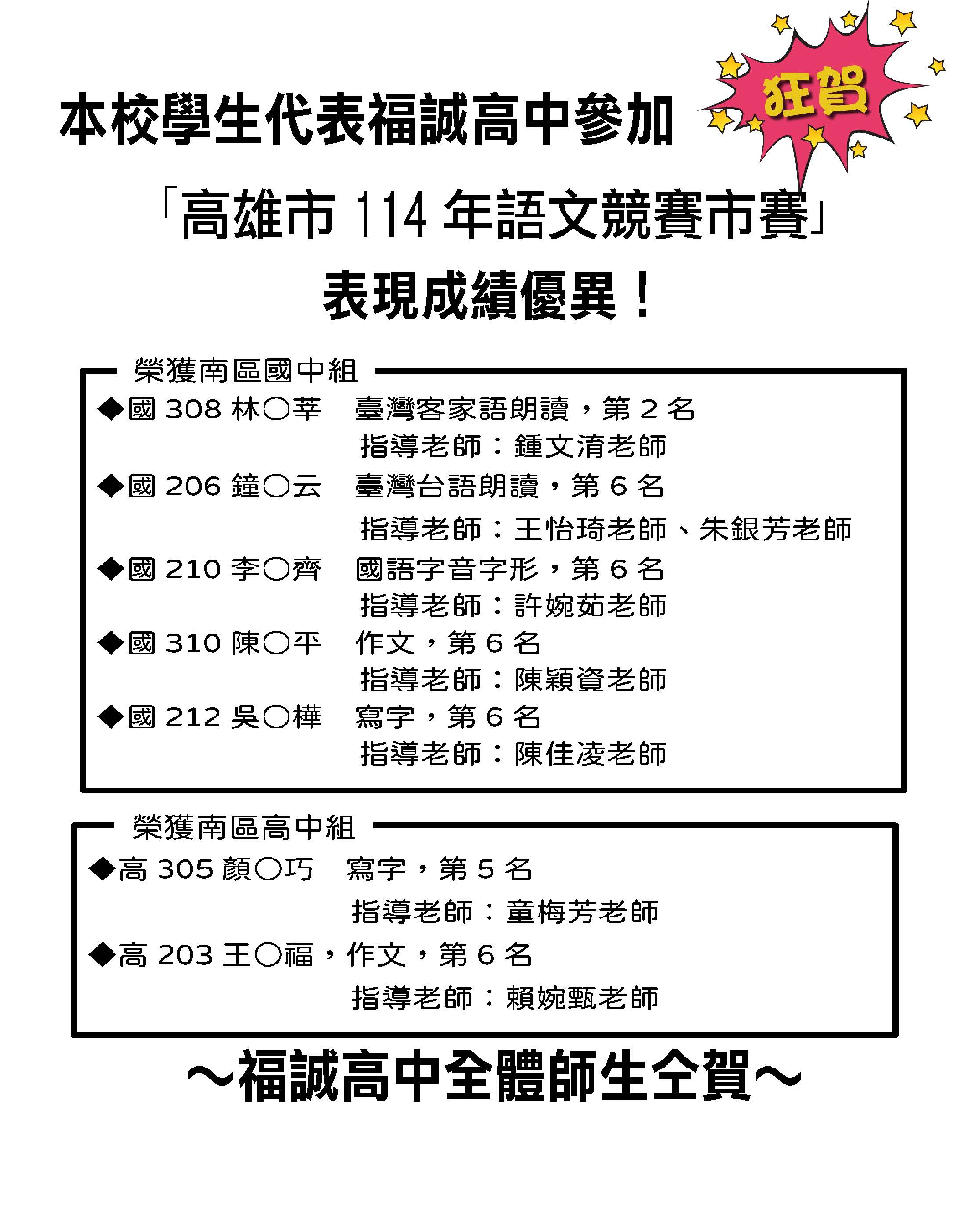 本校學生代表福誠高中參加「高雄市114年語文競賽市賽」成績優異!