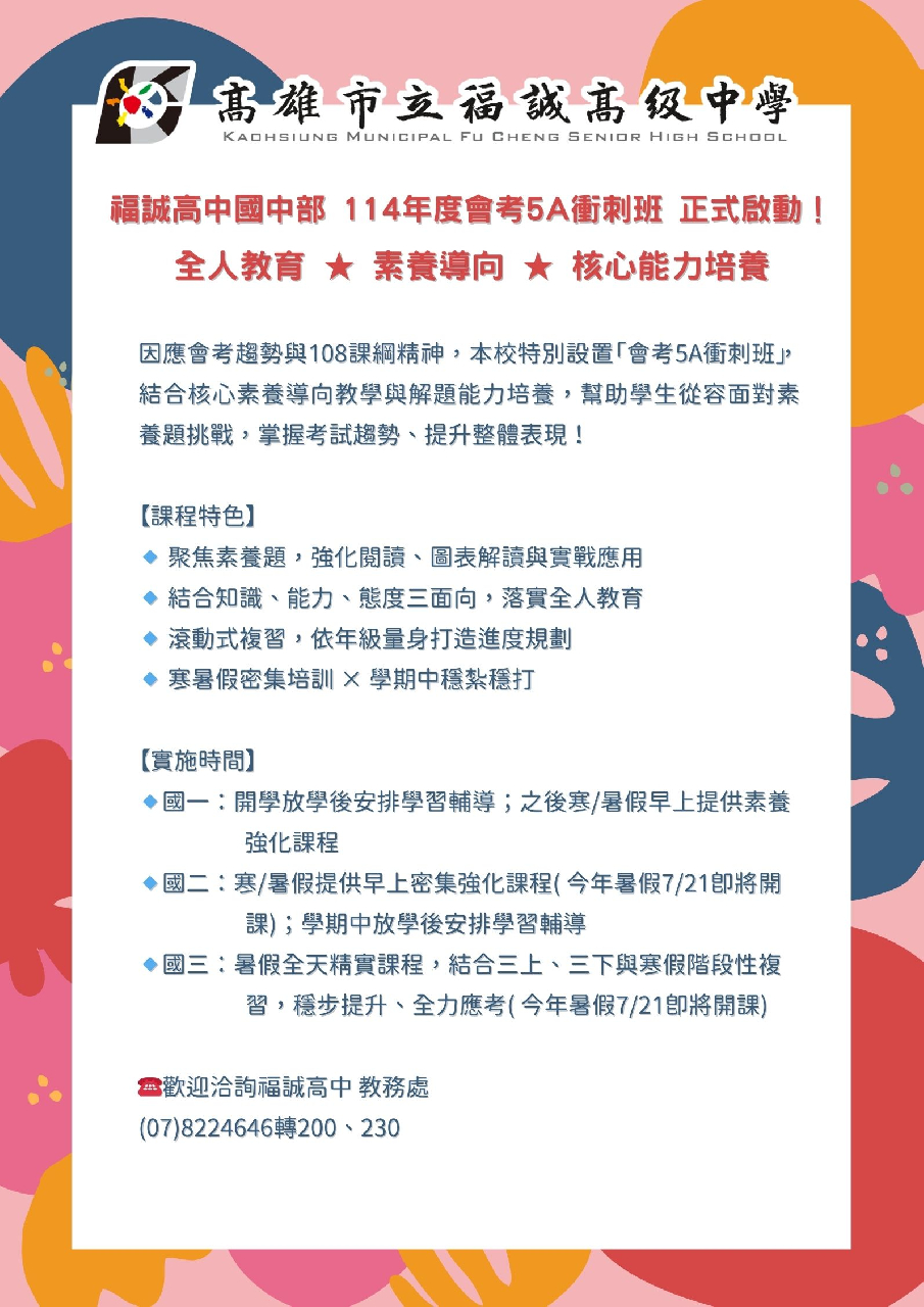 福誠高中國中部 114年度會考5A衝刺班 正式啟動!