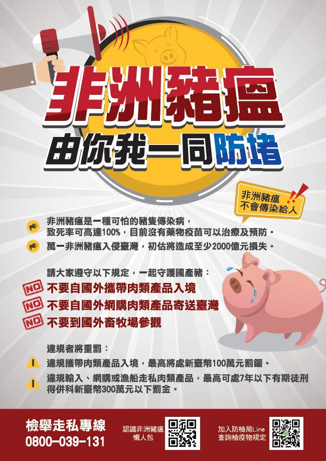 1.返國入境時勿攜帶動植物檢疫物,並請轉知國外親友,勿郵寄豬肉產品等動物檢疫物到臺灣,以免受罰。